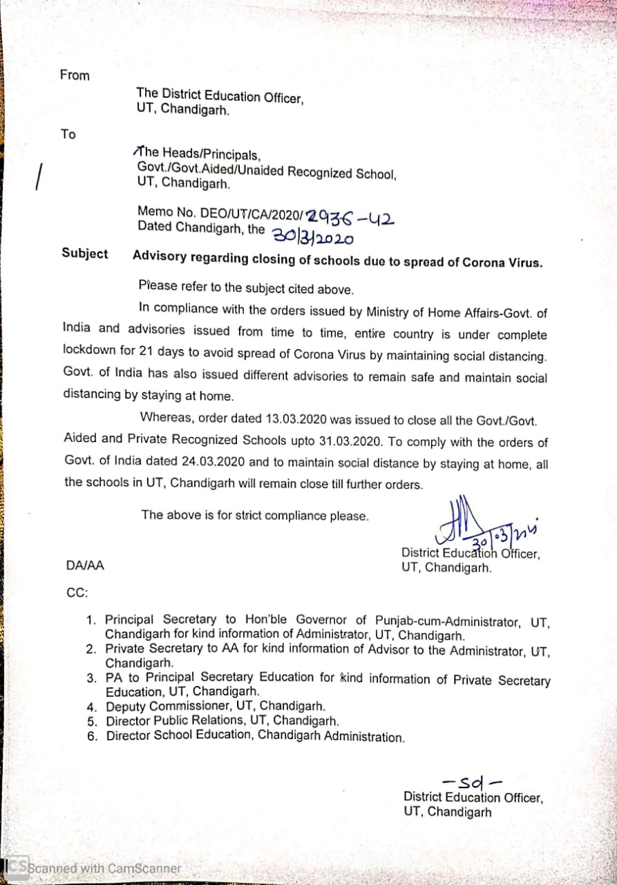 Advisory regarding closing of schools due to spread of Corona Virus